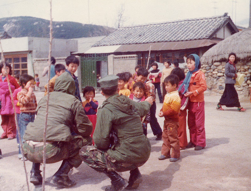 50. Two marines with some local kids at a small village.
