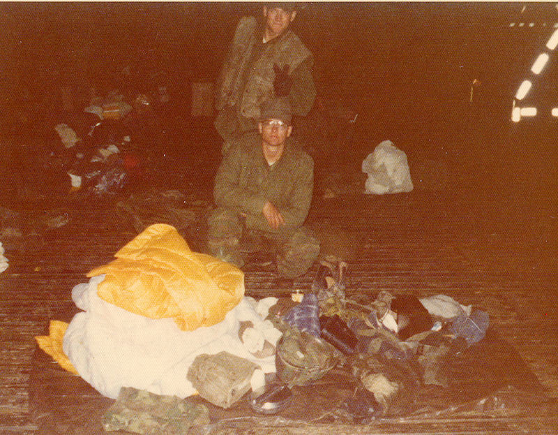 62. Mark Filkins in front and Ken Arnold at Taegu Air Base. Customs inspection before the flight back to Okinawa. Everyone had to lay out all their stuff on the tarmac.